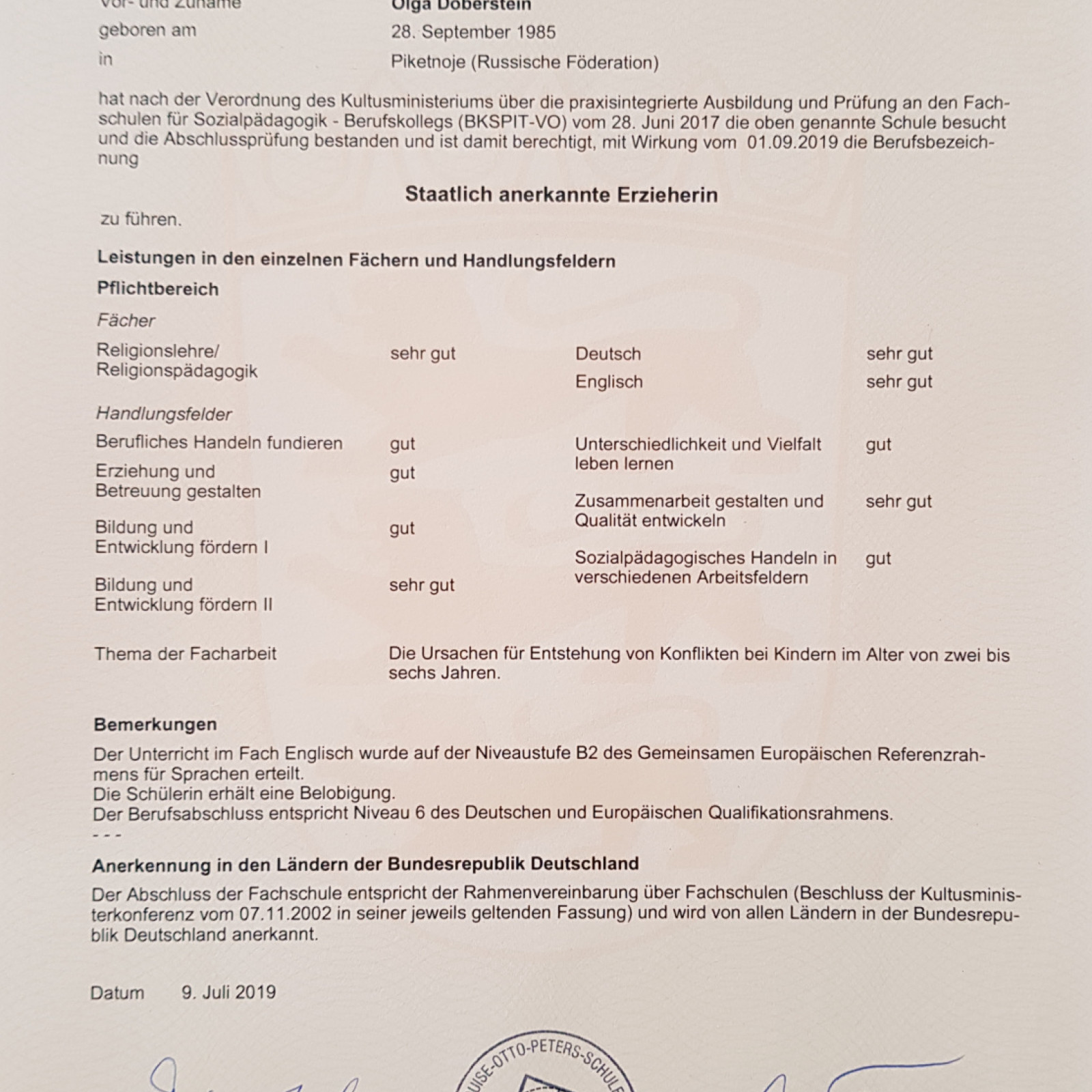 Ausbildung zur Erzieherin und Tagesmutterqualifikation.
